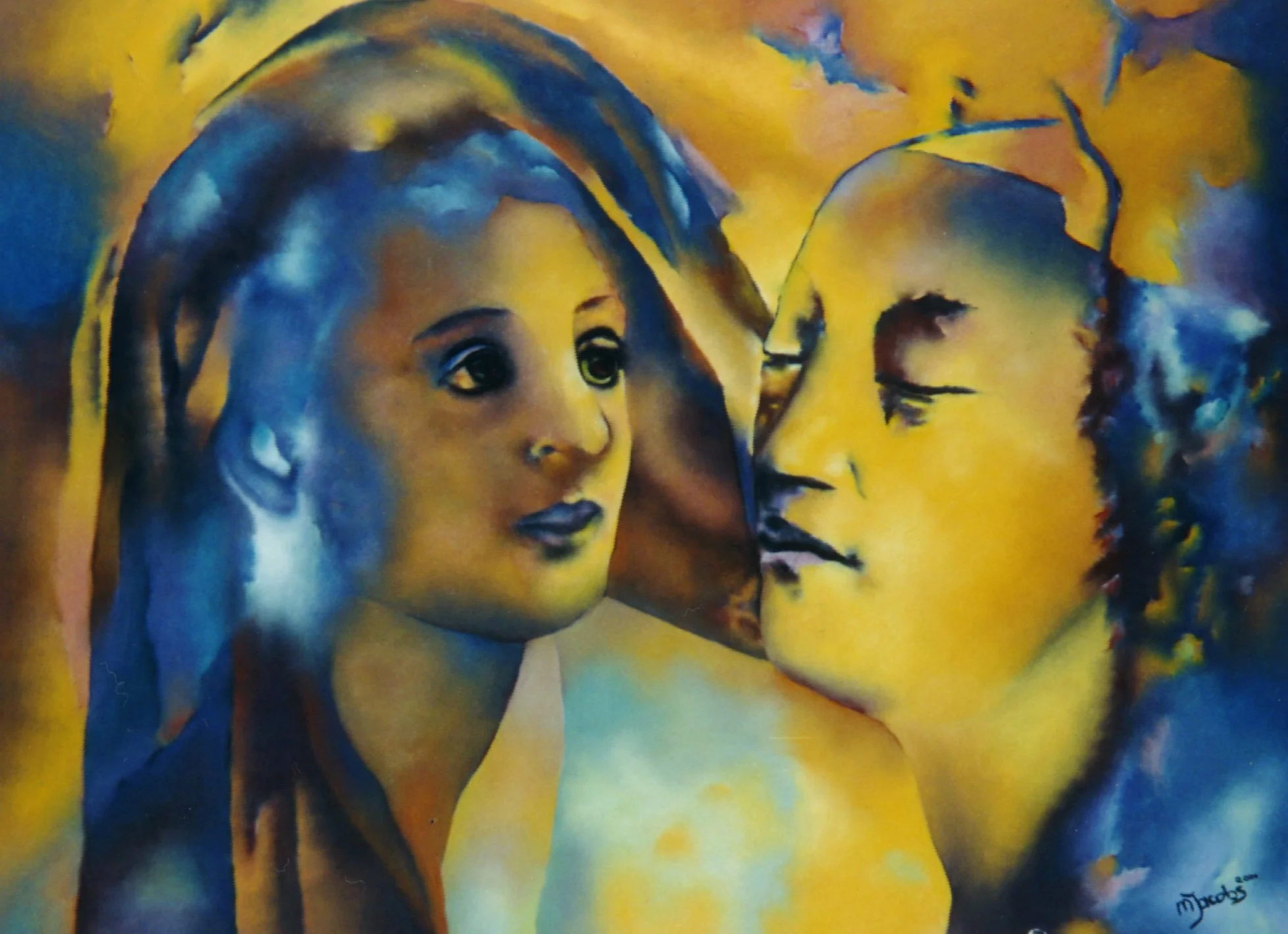 The result is a hybrid visual language that evokes both art historical echoes and personal reflection, through which Jacobs investigates how spiritual icons function within a contemporary, digital context.