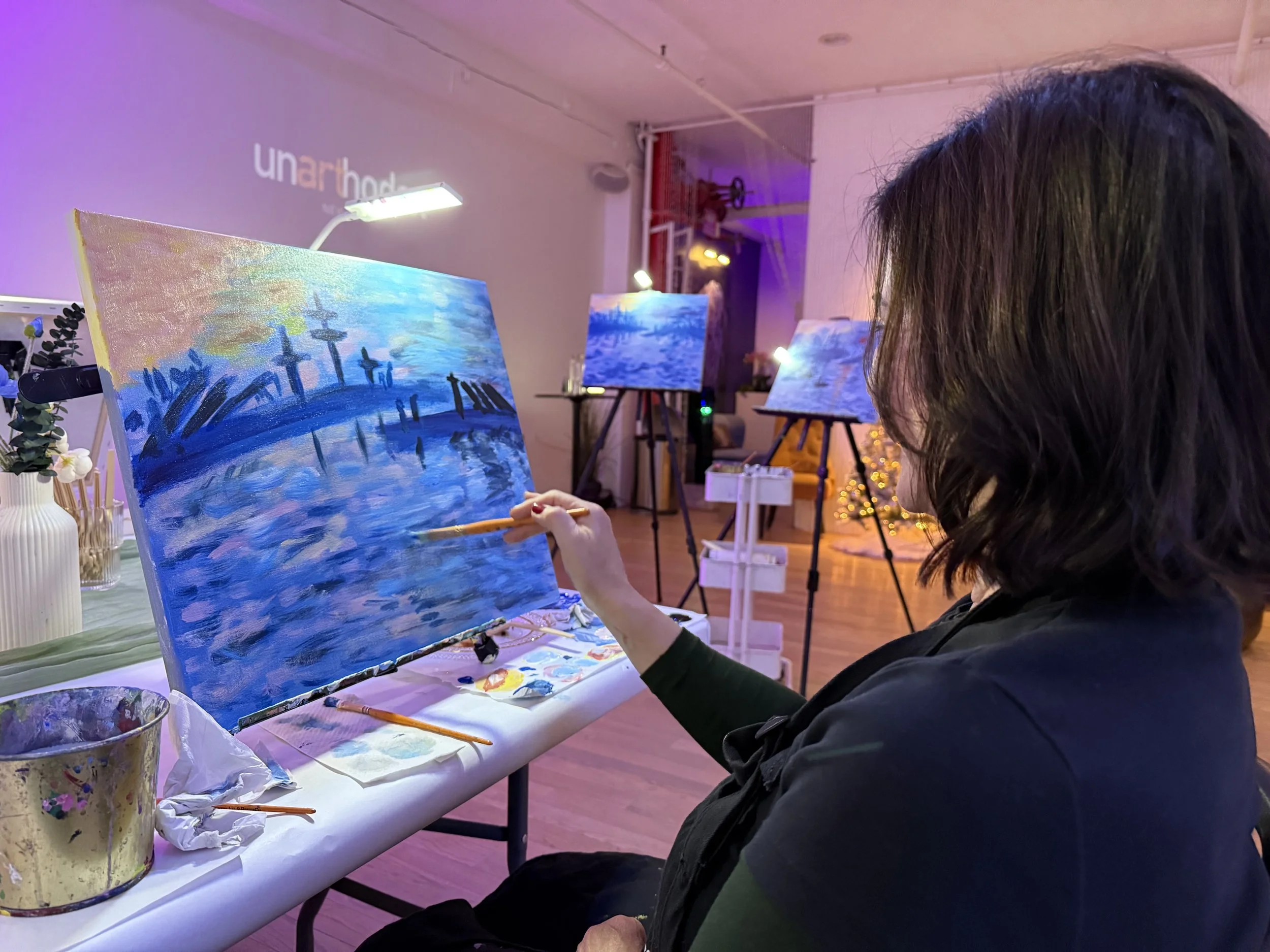 There’s a moment during these Unarthodox workshops when you fully forget yourself. You’re not thinking about that work email or what you’ll have for dinner. You’re just mixing colors, layering brushstrokes, responding to what’s in front of you. That in-the-moment feeling is rare, and it’s what makes these experiences stand out.
