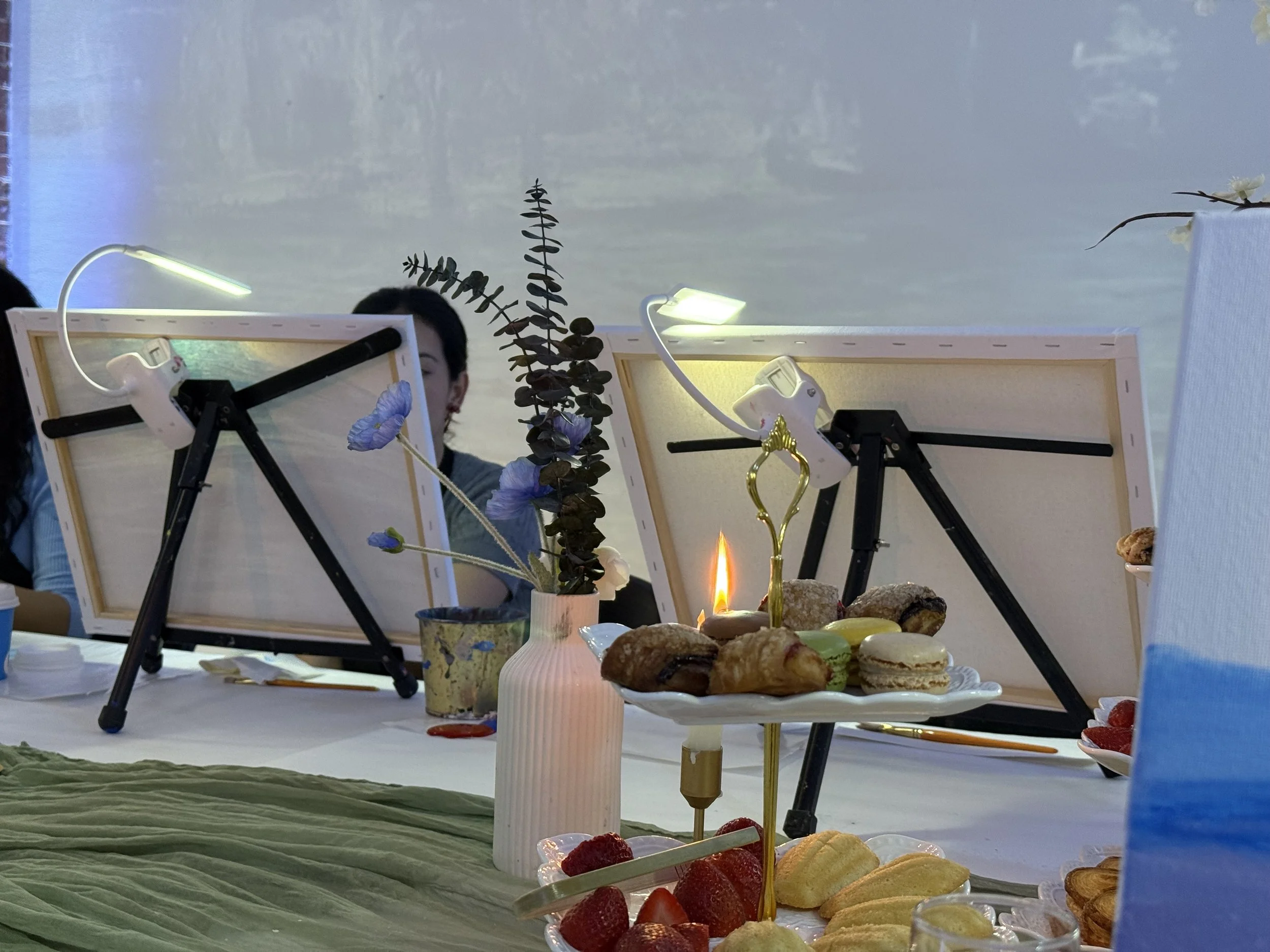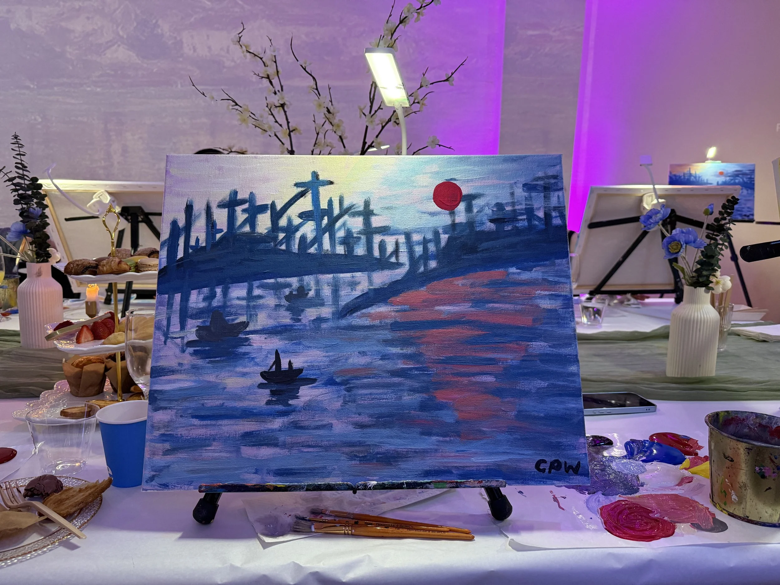 Our sweet instructor, Sarah, walked us through the basics, but the emphasis is never on recreating a Monet painting. Instead, you’re encouraged to use your own colors, your own style, your own instincts. The guidance is there if you need it, but the real goal is to let go. You don’t need to know how to paint — you just need to give yourself permission to explore.