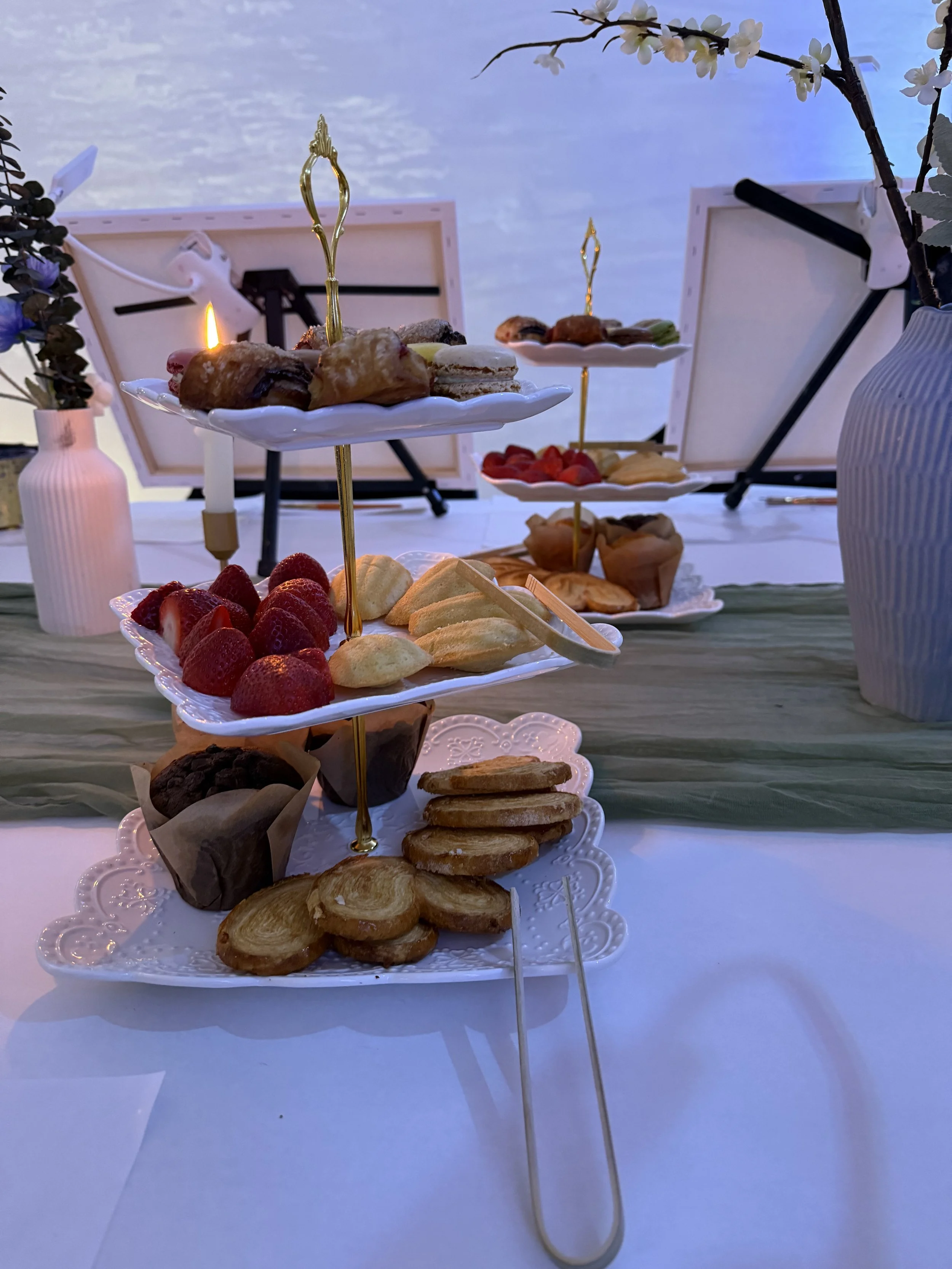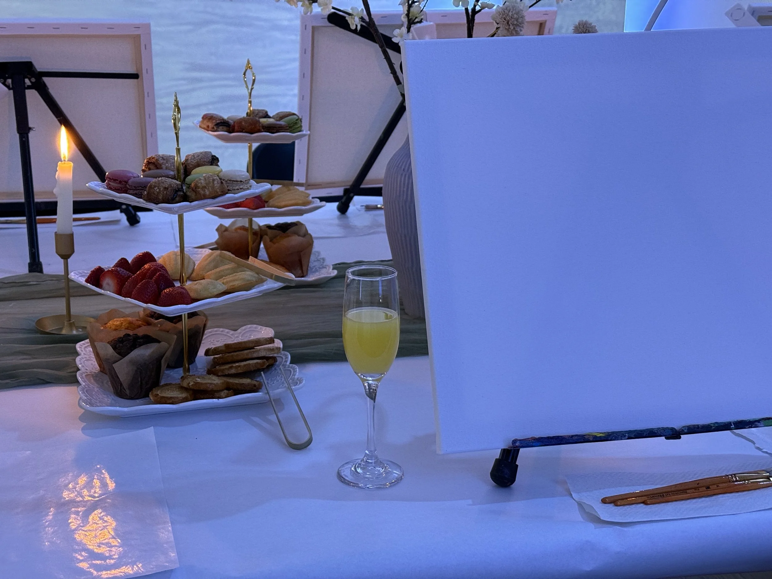 And then there’s the brunch, which honestly deserves its own paragraph. Bottomless mimosas flow freely, along with coffee, pastries, strawberries, muffins, and macarons. It’s indulgent without being distracting — the kind of setup that makes the whole experience feel relaxed and celebratory rather than structured or rushed.