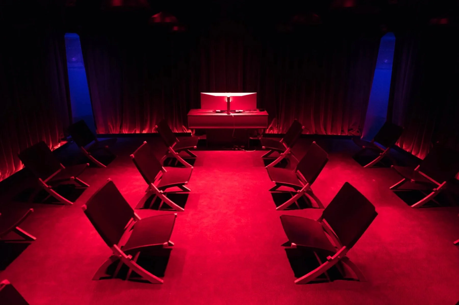 Between these virtual narratives, participants are enveloped in 360-degree audio experiences, prompting reflection and imagination in the darkened space.
