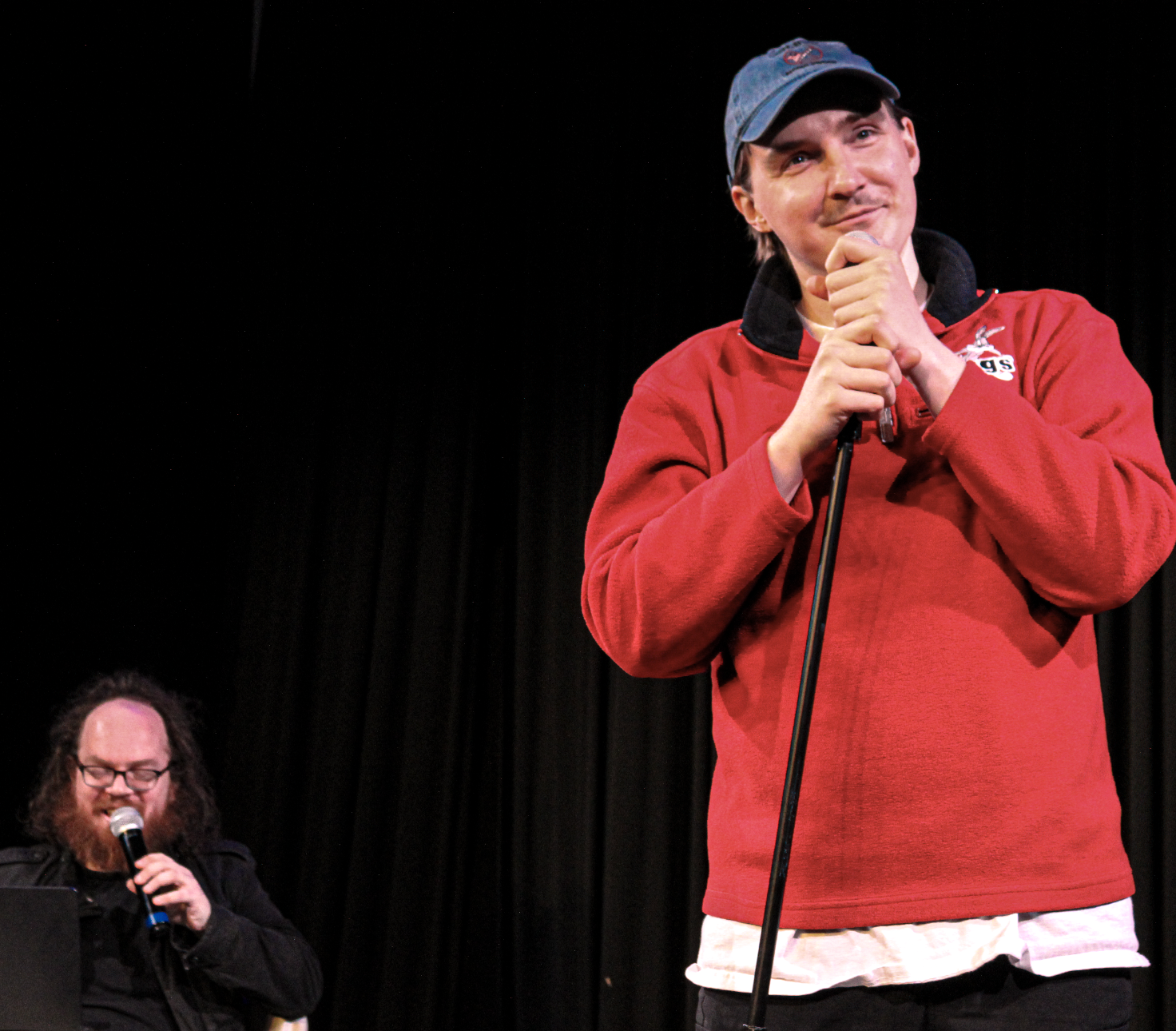For the next half hour, Weiss sets up calculated, timed segments for the two comedians to dish out their jokes, allowing the audience to provide feedback. The humor is crude and, at times, horrendously not funny, but the delivery of the jokes has everyone laughing regardless of the material. The timed intervals are separated into six segments of five minutes, two minutes, one minute, 30 seconds, 15 seconds, and then one final closing joke. After each comedian takes their turn, Weiss offers advice, critiques their jokes, and has Timmy and Pete tell the audience their inspirations and backstory that led them to comedy. Timmy’s character is passionate about his craft, however, his jokes were quite awful, and I found myself laughing at his gags out of pity rather than humor. As this event took place the day after Halloween, Timmy kept repeating “Happy Halloween” at the start of every segment and reused his jokes multiple times. His joke material also consisted of repetitive mockery of his influencer girlfriend and distasteful Dracula jokes. Weiss becomes very combative with Timmy in between the segments and is confused about why the lackluster comedian is terrible at something he claims he is well-versed in. It is a hilarious exchange between the two men, with each intermission of their opposing chemistry consistently met with audience laughter.