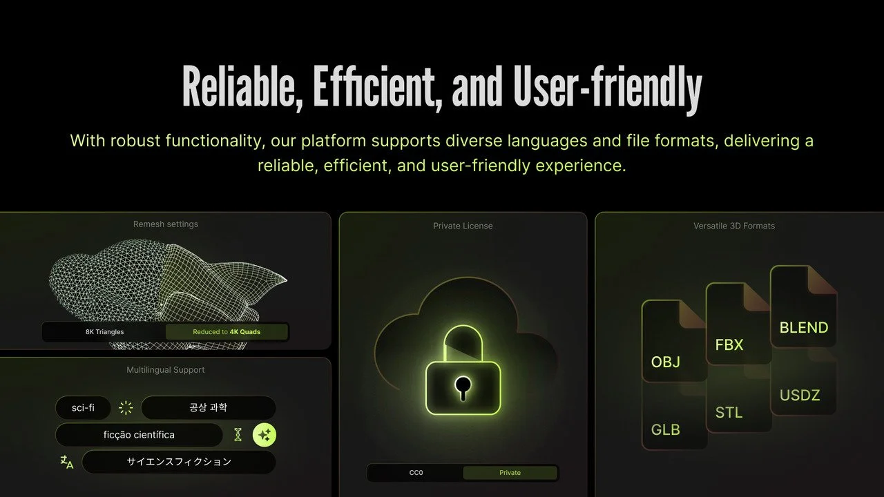 Seamless Export & Plugin Integration: Easily export models in OBJ, FBX, GLB, USDZ, and more, with plugin support for Blender, Unity, and other industry-standard 3D tools to streamline your workflow.