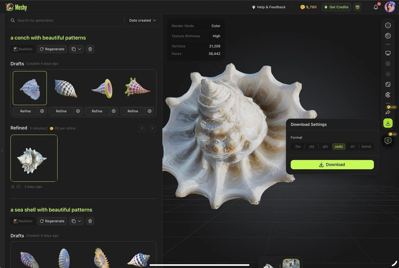 When she discovered Meshy, everything changed. Using simple prompts or uploading AI-generated sketches from Midjourney, she now generates 3D models of anything from cyberpunk chokers to fantasy conch shells. Meshy’s auto-texture generation became her favorite feature—especially for materials such as crystal, aged metal, or knitted fabrics.