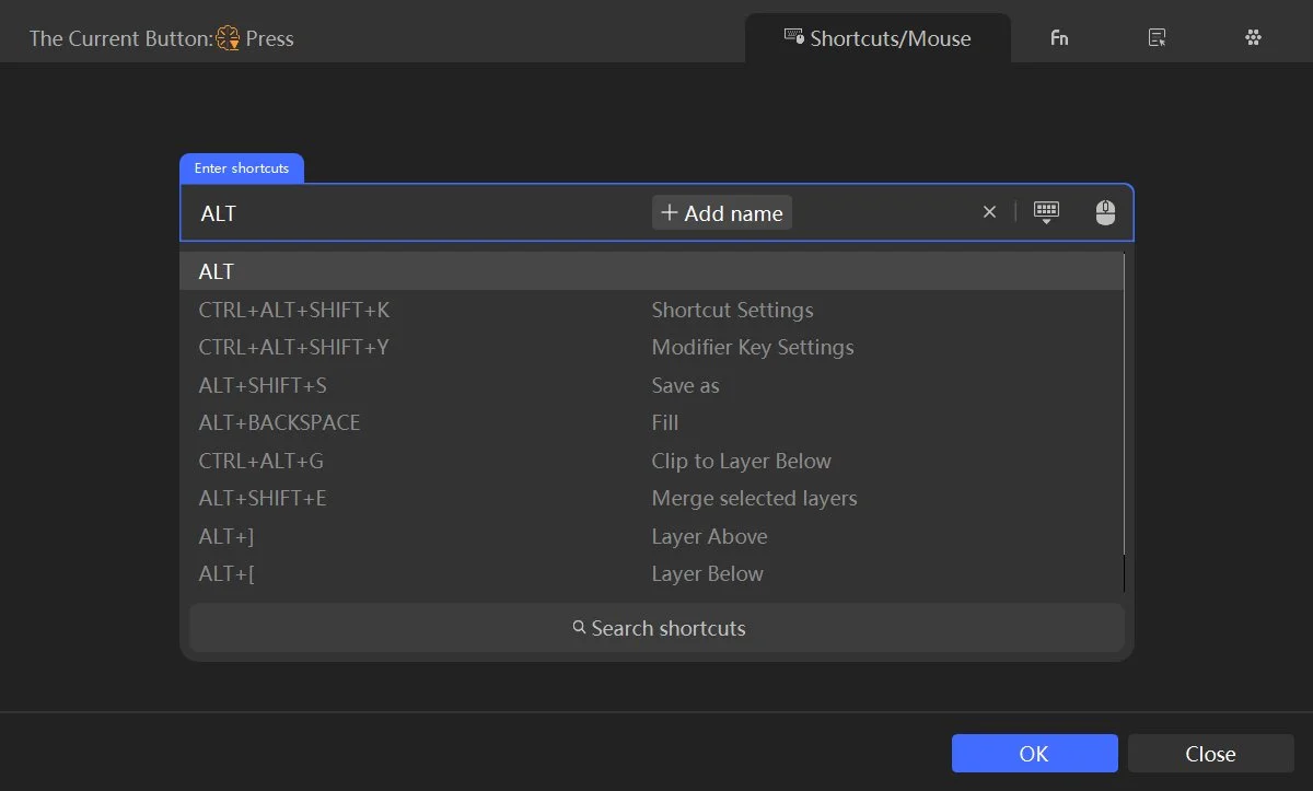 Things like brush size, brush opacity, mouse wheel, and canvas rotation were already set in the official presets. You can add more actions. If you know the shortcuts for CSP or any creative app you use, setup is very simple. The setup interface also shows shortcut hints.